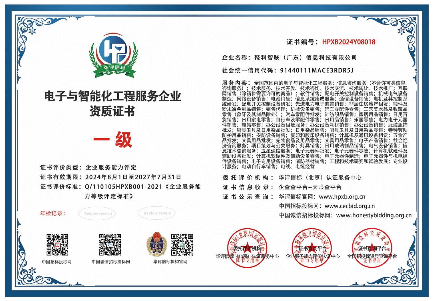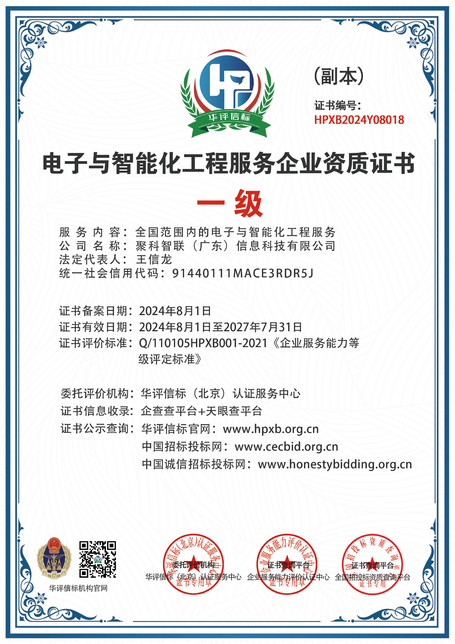 我們擁有證書:電子與智能化工程服務企業資質一級證書、安防施工維保服務企業資質一級證書、智能建筑弱電高級工程師、華為HCIP高級認證ICT工程師證書、特種作業操作證、電工作業證、海康區域認證二級專營店、大華股份認證服務商、品牌商標認證第9類認證,第37類認證、頂級國際域名證書、等一系列權威證書認證。 我們一直以優質的服務和過硬的技術為核心產品一直不斷更新研發至今,致力于打造中小企業優質的互聯網信息化產品設備提供服務商。